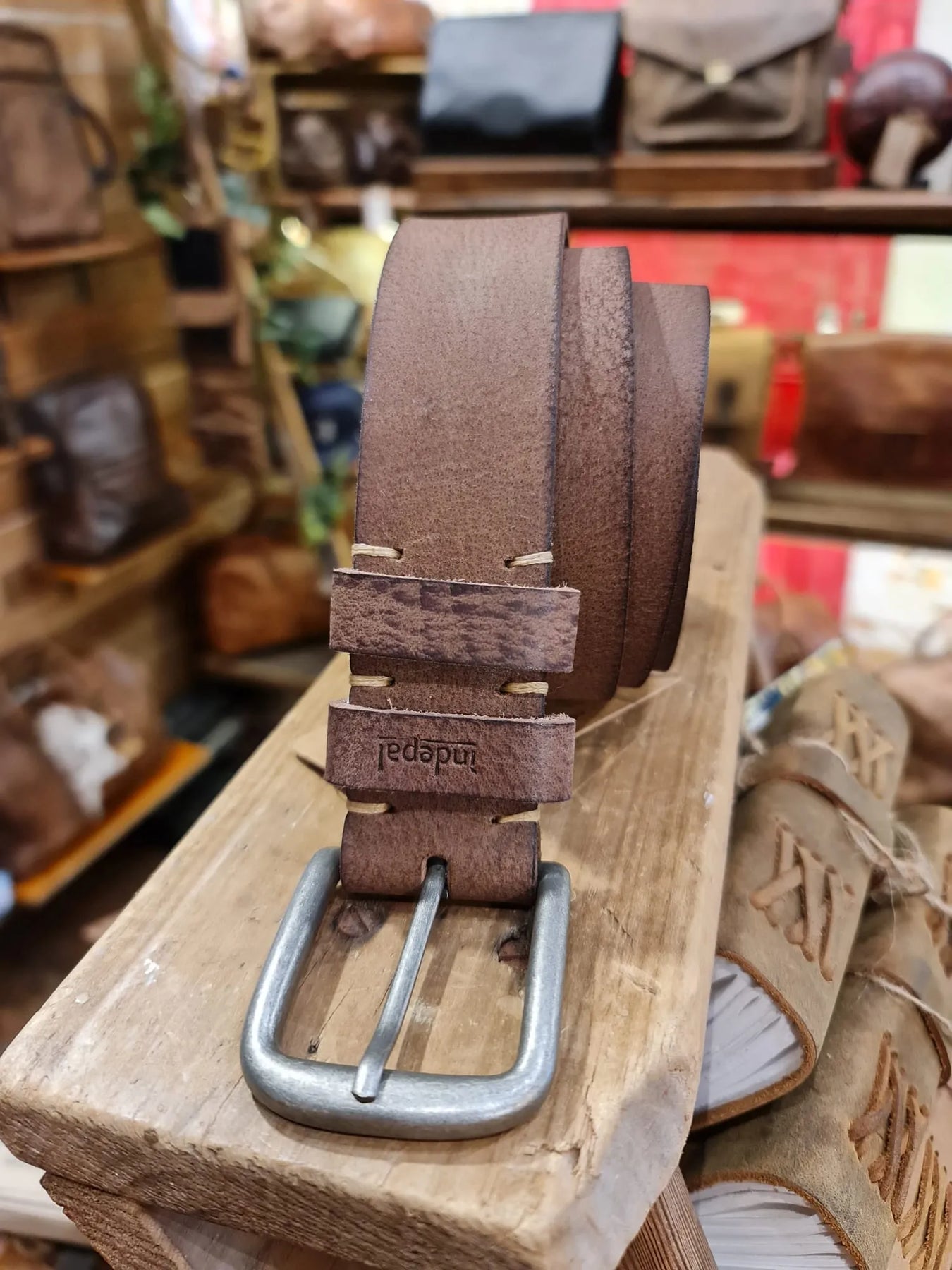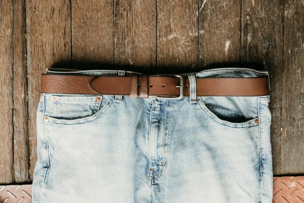 Brown leather belt on a pair of light blue jeans against a wooden background Belts belt-morphett-1 indepal-leather.myshopify.com